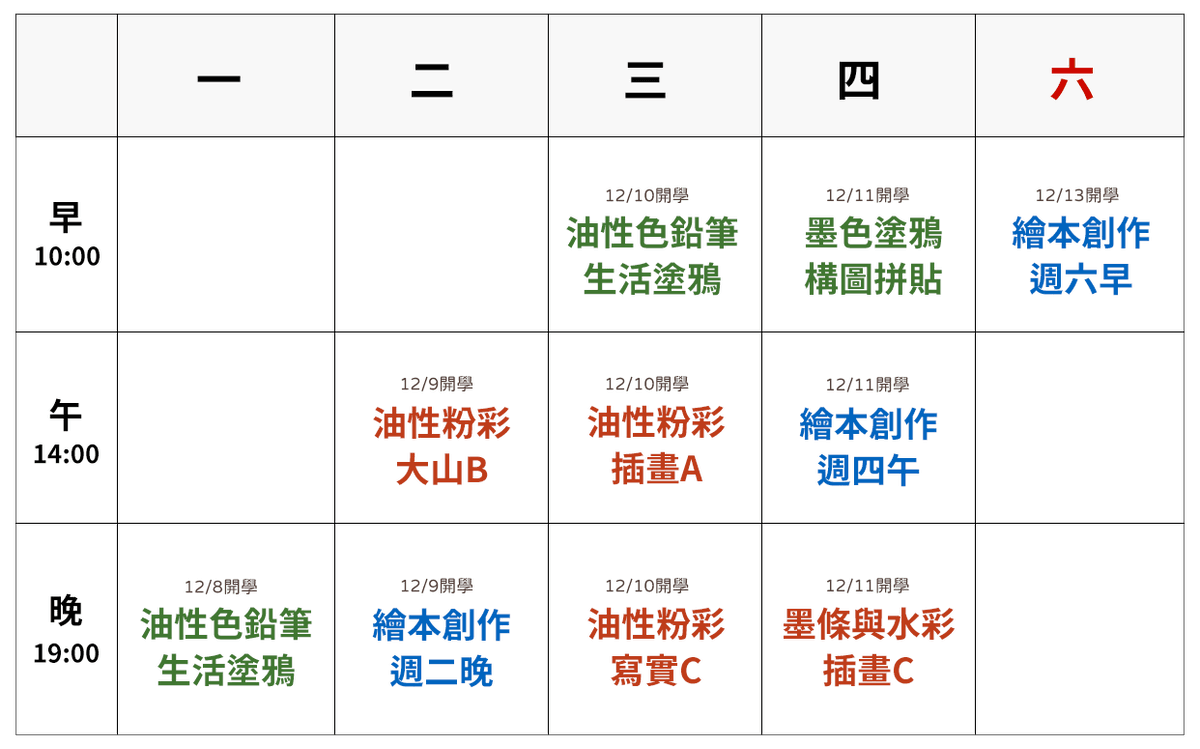 - 課程:技法班全學期線上教學,繪本班於期末舉行實體聚會,若預約出席未達5人,將改以線上課進行。